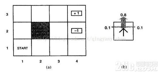 假设一个智能体处于下图(a)中所示的4x3的环境中。从初始状态开始,它需要每个时间选择一个行为(上、下、左、右)。在智能体到达标有+1或-1的目标状态时与环境的交互终止。如果环境是确定的,很容易得到一个解:[上,上,右,右,右]。可惜智能体的行动不是可靠的(类似现实中对机器人的控制不可能完全精确),环境不一定沿这个解发展。下图(b)是一个环境转移模型的示意,每一步行动以0.8的概率达到预期,0.2的概率会垂直于运动方向移动,撞到(a)图中黑色模块后会无法移动。两个终止状态分别有+1和-1的回报,其他状态有-0.4的回报。现在智能体要解决的是通过增强学习(不断的试错、反馈、学习)找到最优的策略(得到最大的回报)。