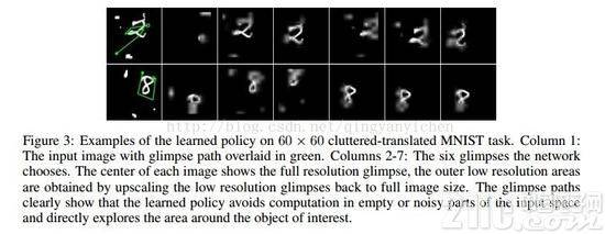 由于注意力模型可以关注图像相关部分,忽视无关部分,所以能够在在有干扰的情况下识别,识别效果也是比其他网络要好的。下面这个图表现的是注意力的路径,表明网络可以避免计算不重要的部分,直接探索感兴趣的部分。