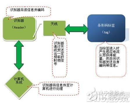 无线电的信号是通过调成无线电频率的电磁场,把数据从附着在物品上的标签上传送出去,以自动辨识与追踪该物品。某些标签在识别时从识别器发出的电磁场中就可以得到能量,并不需要电池;也有标签本身拥有电源,并可以主动发出无线电波(调成无线电频率的电磁场)。标签包含了电子存储的信息,数米之内都可以识别。与条形码不同的是,射频标签不需要处在识别器视线之内,也可以嵌入被追踪物体之内。