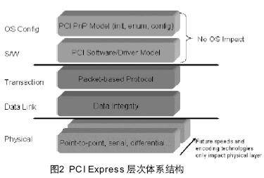 如图 2 所示,即 PCI Express |0'>PCI Express 的层次体系结构。它保持了与 PCI 寻址模式(加载-存储体系结构且具有单层地址空间)的兼容性,从而保证了所有现有的应用程序和驱动操作无需改变。PCI Express 配置使用的是PCI 即插即用标准中所定义的标准机制。软件层发出读和写请求,并使用基于数据包、分段传输的协议通过处理层传输至I/O 设备。