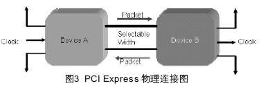 基本的PCI Express 链路包括两个低电压的AC 耦合差分信号对(一个传输对和一个接收对),如图3所示。物理链路层信号使用一个去加重(de-emphasis )策略来减少符号间干扰,从而提高了数据完整性。数据时钟通过使用 8b/10b 的解码策略来嵌入,从而到达极高的数据传输率。初始的信号发生频率是每个方向 2.5 Gb/s (生成1个信号) 而且它将会随着硅工艺的提高而增加至每个方向10 Gb/s(信号在铜线中传输可能实现的最大速率)。两个链路层的 PCI Express 代理在物理层上传输数据包。