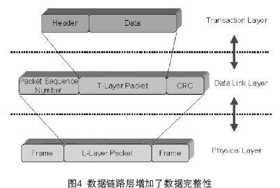 链路层的主要作用就是保证数据包在 PCI Express 链路上的可靠传输。链路层负责数据完整性并向处理层的数据包添加序列号和循环冗余校验,如图4所示。大部分数据包在处理层初始化。一个基于优先数的、流量控制的协议保证了数据包仅在另一端具有接收这个数据包的缓冲区情况下才能传输,这样就去除了任何数据包的请求以及由于资源限制而引起的总线带宽浪费。链路层会自动的重新收发一个被标记为损坏的数据包。