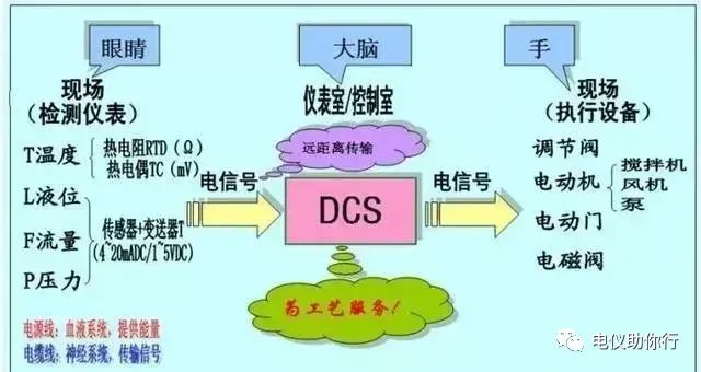 就如下图所示,DCS相当于大脑,对眼睛看到的情况(即现场检测仪表传输过来的信号,如水位降低)做出反应(即发出指令,如增大进水阀开度),现场执行设备接受到指令做出相应的动作(如增大进水阀门开度,保持水位在一定范围)。