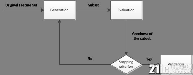 特征选择的一般过程可用图1表示。首先从特征全集中产生出一个特征子集,然后用评价函数对该特征子集进行评价,评价的结果与停止准则进行比较,若评价结果比停止准则好就停止,否则就继续产生下一组特征子集,继续进行特征选择。选出来的特征子集一般还要验证其有效性。