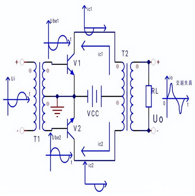 虽然理论上已经证明乙类推挽功率放大器的理想最大效率远高于甲类,但是乙类推挽功率放大器,因为基极无加静态偏置,输出在正负半周交界处会有交越失真。