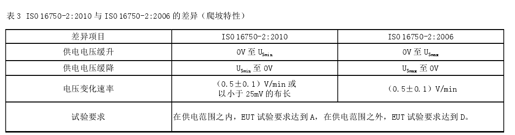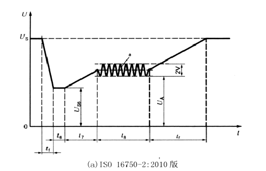 爬坡特性:在 ISO 16750-2 中,该试验模拟蓄电池逐渐放电和充电条件下,EUT 的承受能力。该特性持续的时间基本上都比较长,其电压变化是连续而缓慢的,并且电压的变化呈直线变化。供电电压缓降是模拟诸如在长期不使用车辆时由内置设备(时钟)带来的电池逐渐放电现象;供电电压缓升是连接车载充电会带来电池的缓慢充电。
