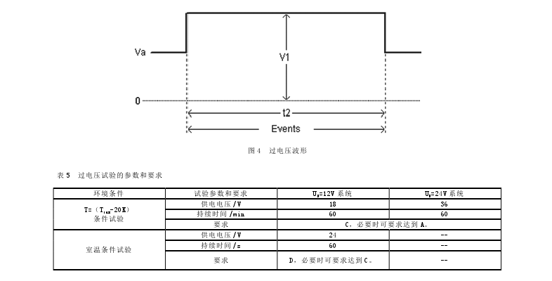 条件试验和室温条件试验。T=(Tmax-20K)条件试验主要是为了模拟当发动机调节器失效引起的发电机输出电压上升到高于正常电压且处于一定环境温度的现象,室温条件试验是为了模拟辅助启动现象。过电压的试验要求详见图 4 和表 5。