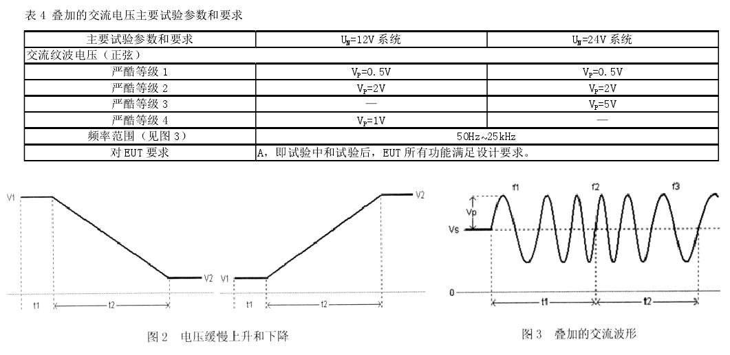 叠加交流电压:ISO 16750-2 规定的叠加交流电压试验是为了模拟直流供电下的纹波电压对 EUT 的承受能力。汽车运转时,发电机和蓄电池并联,同时向各种用电器供电。发电机的主要作用在于向蓄电池充电,其输出是带有交流纹波分量的,同时像大功率的音频设备,也会给并联的设备带来交流电压分量。这些叠加电压波形在大多情况下为正弦波,但是在一些车厂标准中规定为阻尼振荡波(Renault 36.00.400/C)、 三 角 波(VOLVO STD 515-0003)等。ISO 16750-2 标准中的主要参数见图 3 和表 4,可以根据 EUT 在车辆安装中的位置,选择不同的严酷等级。