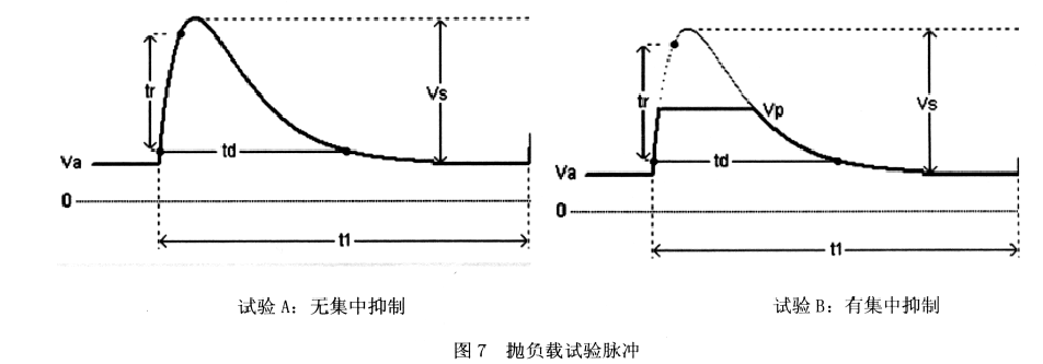 抛负载: 抛负载是指发电机供电系统中,因瞬时卸载而在发电机端产生的远大于供电电压的瞬时脉冲,一般发生在发电机满载运行或充电状态,蓄电池连线突然断开产生的抛负载现象,瞬间电压峰值可达额定供电电压的 5~10倍。由于电子设备在车上的应用越来越多,车辆生产商和零部件供应商也对抛负载试验做了很多研究和尝试,积累了许多有效抑制抛负载的经验。在 ISO 16750-2 中分为两类:无集中抑制(试验 A 适用)和有集中抑制(试验 B 适用),试验波形见图 7。无集中抛负载抑制的 EUT,其电路中必须自备抛负载抑制的功能电路和措施,一般可采用开关器件或晶体管和可控硅组成的保护电路进行分流调节的方式,例如雪崩二极管、TVS 管等;也可以采用具有集成电路管理电源或线性稳压的方式。集中抛负载抑制通常通过交流发电机内部钳位电路实现,从而吸收脉冲的能量。