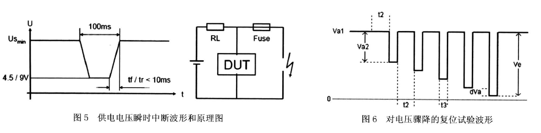 电压中断: 在 ISO 16750-2 中主要包括供电电压瞬时下降和对电压骤降的复位性能两个试验。供电电压瞬时中断主要是为了模拟常规熔断器元件在另一电路熔化的现象,见图 5。在这个试验中,要求试验脉冲的上升和下降时间≤ 10ms,EUT 试验要求达到 B。对电压骤降的复位性能试验用于验证被测设备在不同电压中断情况下的复位能力,波形见图 6。该试验适用于具有复位功能的被测设备(例如:带有微控制器的设备)