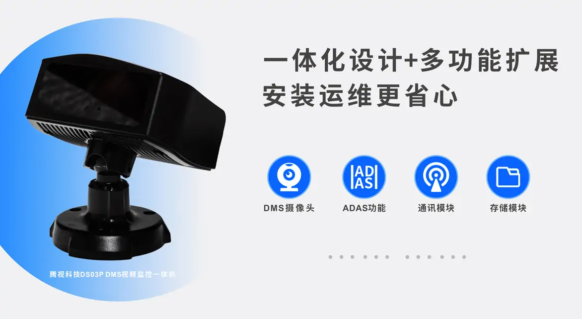 腾视科技DS03P DMS视频监控一体机,高度集成化设计,彻底解决传统多设备叠加痛点,将DMS摄像头、ADAS功能、通讯模块、存储模块等集成于一体,外观小巧(尺寸仅:92.8*85.5*102.0(mm),重量仅0.44kg,安装方便,真正实现“一机替代多机”,为车辆节省更多空间。