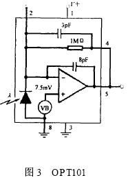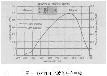 在本文中, 采用一种新型的光敏元件OPT101 , 该元件将感光部件和放大器集成在同一个芯片内部, 这种集成化的设计方式有效地克服了后端运算放大器空载电流输出对光敏部件输出电流的影响, 而且芯片输出的电压信号可以通过外部的精密电阻进行调节, 有利于芯片适应整体的电路设计, 同时芯片的集成化设计也能够减小系统的功耗。