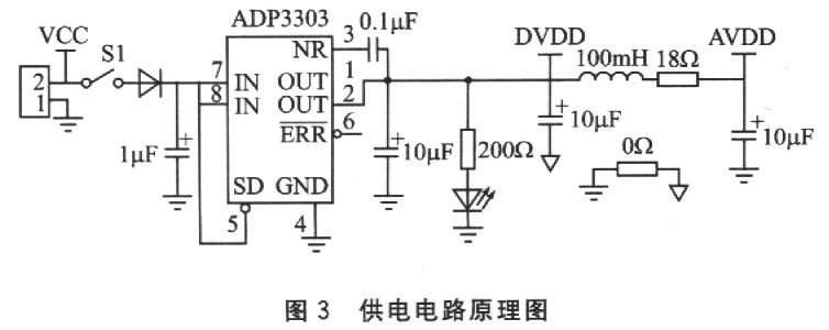 由于井下工作电源一般是由9~12 V的锂电池提供,而系统所有元件的工作电压均在5V左右,所以需要对9V的电源进行整流至系统5V输入供电。供电部分所采用的ADP303电压变换器,是一款高精度、200mA低漂移的线性整流器,特别适合于小功率系统的电源整流供电。其工作电压范围为3.2~12 V,可以解决由于外部电压不足而导致系统无法正常工作的问题。由于系统器件分为模拟器件和数字器件两部分,因此相应地分为模拟和数字供电。整流输出的5V供电经l00mH的电感和1.8Ω的电阻分别为模拟电源和数字电源供电,这样可以大大降低供电对数字器件的干扰。而模拟地和数字地也需要经过0Ω的电阻进行滤波才可以连接到一起,以便减小干扰,尤其是对精度高的数字器件应用时更应该注意这点。原理图如图3所示。