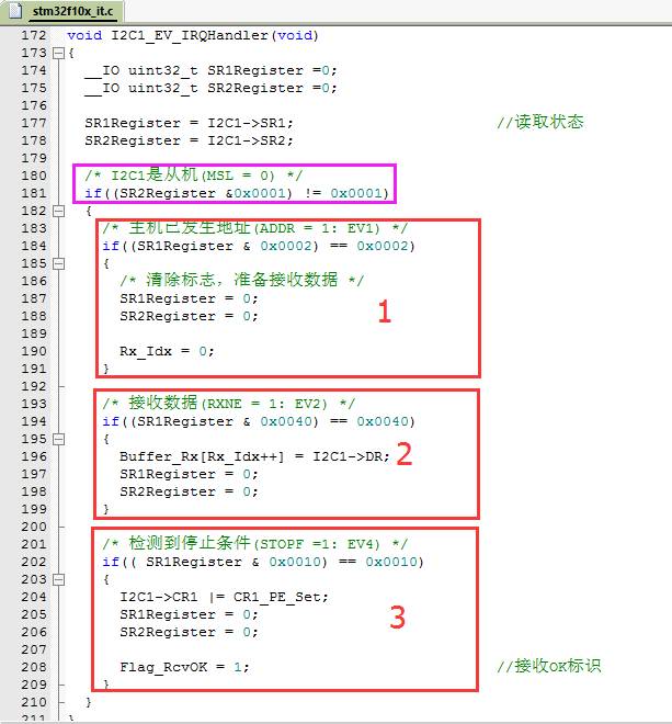 进入I2C事件中断,判断是I2C从机事件,此时,作为从机接收数据需要检测三个标示:
