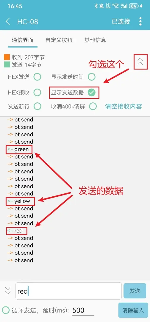 比如我们给蓝牙模块发送数据 green 、yellow、red。