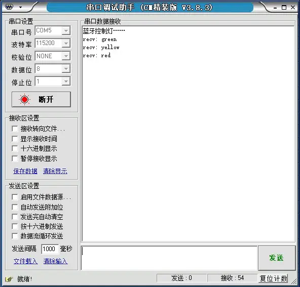 可以看到串口助手成功接收到了 green 、yellow、red,这些数据。