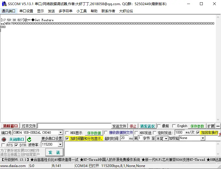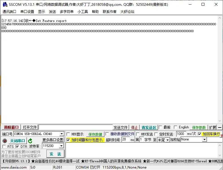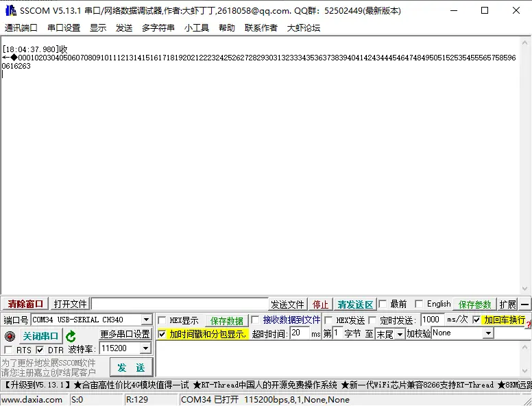 然后点击打开USB,勾选Hex显示,检测收发数据,可以看到开发板向计算机发送的数据,长度为64字节: