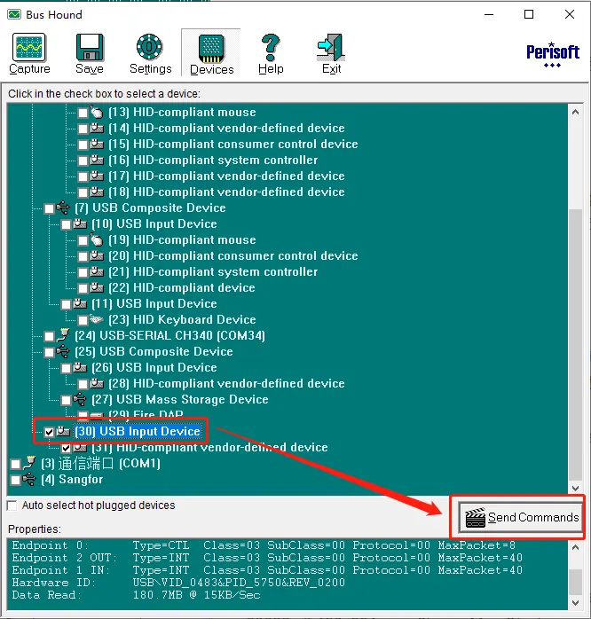 打开Bus Hound,在Devices页面找到我们的HID设备,注意VID和PID与我们设置的一致,勾选该设备: