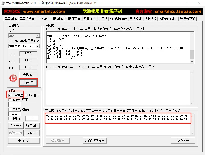 点击打开USB,勾选Hex发送,修改下方的数据为想要发送的数据: