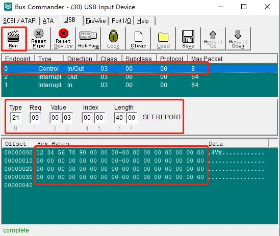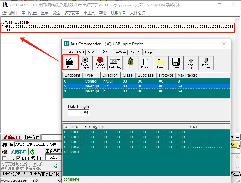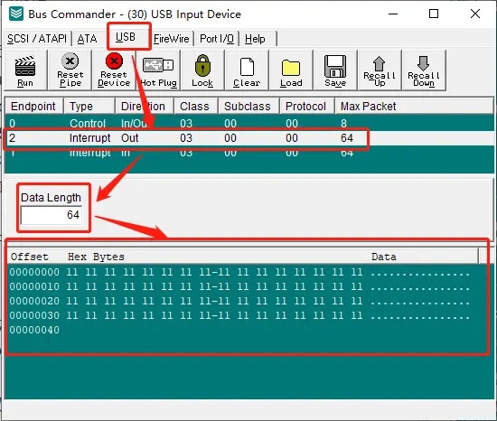 选中USB选项卡,然后选中Interrupt Out,在Data Length处填入64,即需要发送64个字节;修改下方的数据为想要发送的数据,这里为便于观察,设置成全0x11,然后点击Run发送。