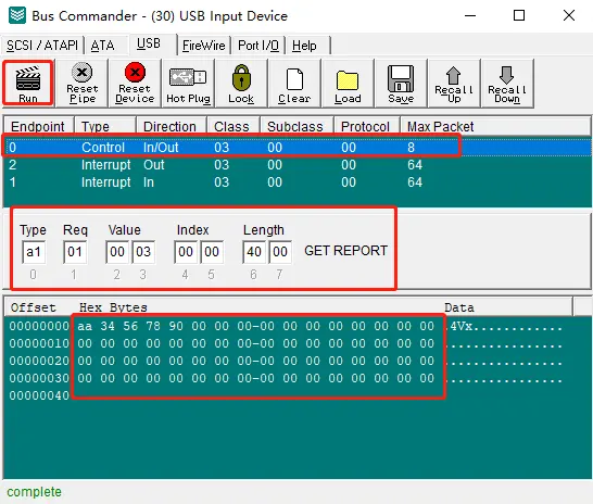 然后切换到Capture页面,点击Run,检测收发数据,可以看到开发板向计算机发送的数据,长度为64字节:PortHelper