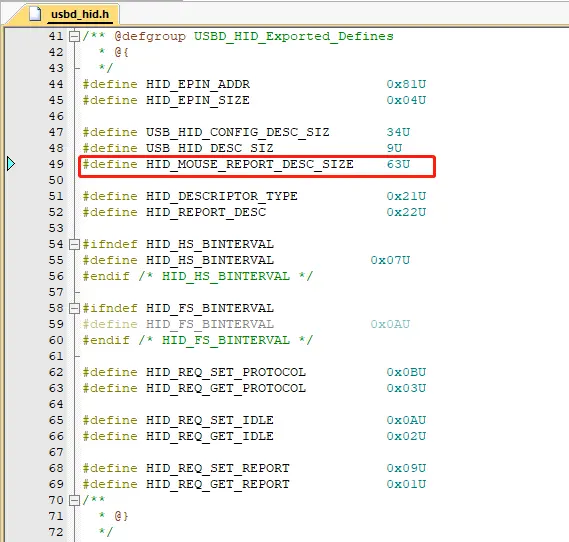 打开usbd_hid.h文件,修改HID_MOUSE_REPORT_DESC_SIZE的值为63。