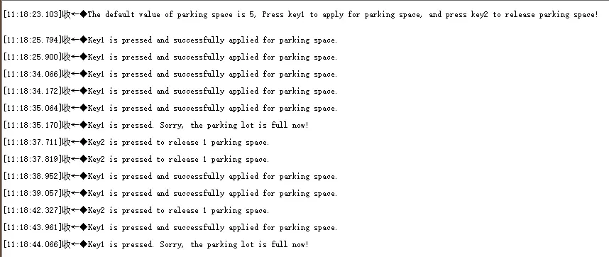 printf('The default value of parking space is 5, Press key1 to apply for parking space, and press key2 to release parking space!nn');