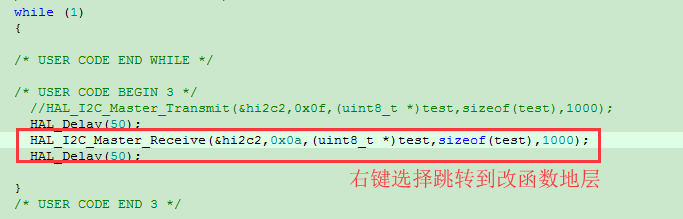 所以主机发送函数选择了 HAL_I2C_Master_Transmit( ); 函数,而我从机则选择HAL_I2C_Slave_Receive( );函数,从机代码如下: