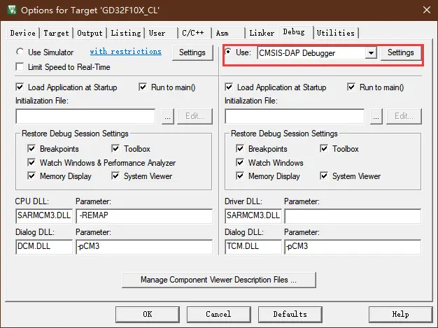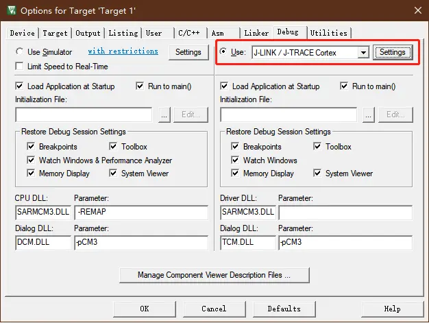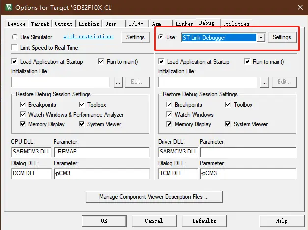 单击 Options for Targe,再选择 Debug 边上是 Use 框是