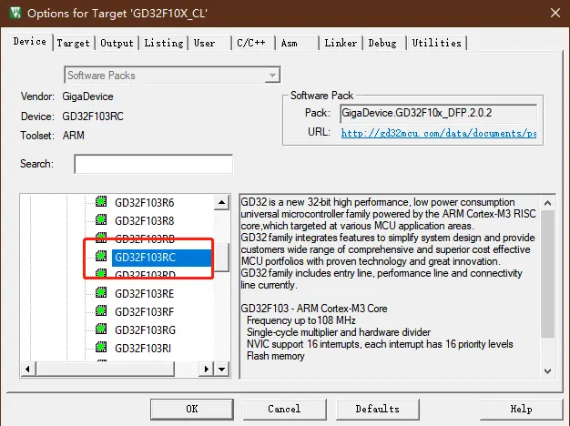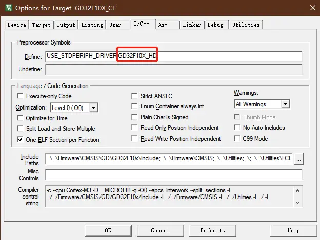 所以 GD32F103RCT6 处于 HD 的产品,点击 Options of Target 在 C/C++ 选项里面将 Define GD32F10X_CL 改为 GD32F10X_HD。