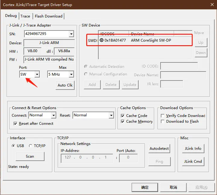 J-LINK 说明选择正确,再单击 Settings,会跳出有 IDCODE 显示,说明已经找到芯片内核,如果没有显示,排查如图箭头所指的 Port 是否选为 SW,还有 J-LINK 驱动是否正确,一般以上排查都能解决问题,最终有 IDCODE 显示,说明板子硬件连接,工程配置都正确,可以进行下一步下载。