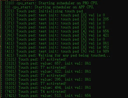#include Read values sensed at all available touch pads. Use 2 / 3 of read value as the threshold to trigger interrupt when the pad is touched. Note: this routine demonstrates a simple way to configure activation threshold for the touch pads. Do not touch any pads when this routine is running (on application start). */static void tp_example_set_thresholds(void){ uint16_t touch_value; for (int i = 0; i < TOUCH_PAD_MAX; i++) { //read filtered value touch_pad_read_filtered(i, &touch_value); s_pad_init_val[i] = touch_value; ESP_LOGI(TAG, 'test init: touch pad [%d] val is %d', i, touch_value); //set interrupt threshold. ESP_ERROR_CHECK(touch_pad_set_thresh(i, touch_value * 2 / 3)); }}// 检测触摸中断任务static void tp_example_read_task(void *pvParameter){ static int show_message; while (1) { //interrupt mode, enable touch interrupt touch_pad_intr_enable(); for (int i = 0; i < TOUCH_PAD_MAX; i++) { if (s_pad_activated[i] == true) { ESP_LOGI(TAG, 'T%d activated!', i); // Wait a while for the pad being released vTaskDelay(200 / portTICK_PERIOD_MS); // Clear information on pad activation s_pad_activated[i] = false; // Reset the counter triggering a message // that application is running show_message = 1; } } vTaskDelay(10 / portTICK_PERIOD_MS); // If no pad is touched, every couple of seconds, show a message // that application is running if (show_message++ % 500 == 0) { ESP_LOGI(TAG, 'Waiting for any pad being touched...'); } }}// 触摸中断处理函数。触摸过的端口保存在s_pad_activated数组中static void tp_example_rtc_intr(void *arg){ uint32_t pad_intr = touch_pad_get_status(); //clear interrupt touch_pad_clear_status(); for (int i = 0; i < TOUCH_PAD_MAX; i++) { if ((pad_intr >> i) & 0x01) { s_pad_activated[i] = true; } }}/* * Before reading touch pad, we need to initialize the RTC IO. */static void tp_example_touch_pad_init(void){ for (int i = 0; i < TOUCH_PAD_MAX; i++) { //init RTC IO and mode for touch pad. touch_pad_config(i, TOUCH_THRESH_NO_USE); }}void app_main(void){ // Initialize touch pad peripheral, it will start a timer to run a filter ESP_LOGI(TAG, 'Initializing touch pad'); touch_pad_init(); // 如果使用中断触发模式,应将触摸传感器FSM模式设置为“ TOUCH_FSM_MODE_TIMER” touch_pad_set_fsm_mode(TOUCH_FSM_MODE_TIMER); // 设定充放电参考电压:高参考电压,低参考电压,高参考电压衰减 // the high reference valtage will be 2.7V - 1V = 1.7V, The low reference voltage will be 0.5V. touch_pad_set_voltage(TOUCH_HVOLT_2V7, TOUCH_LVOLT_0V5, TOUCH_HVOLT_ATTEN_1V); // 配置触摸端口 tp_example_touch_pad_init(); // 初始化并启动软件滤波器 touch_pad_filter_start(TOUCHPAD_FILTER_TOUCH_PERIOD); // 设定中断限值,此时不要触摸,2/3的读取值做为限值 tp_example_set_thresholds(); // 注册触摸中断ISR touch_pad_isr_register(tp_example_rtc_intr, NULL); // 开启一个任务处理电容触摸 xTaskCreate(&tp_example_read_task, 'touch_pad_read_task', 2048, NULL, 5, NULL);} 查看打印: 六、轮询检测按键 根据 esp-idfexamplesperipheralstouch_pad_interrupt 中的例程修改 #include Read values sensed at all available touch pads. Use 2 / 3 of read value as the threshold to trigger interrupt when the pad is touched. Note: this routine demonstrates a simple way to configure activation threshold for the touch pads. Do not touch any pads when this routine is running (on application start). */static void tp_example_set_thresholds(void){ uint16_t touch_value; for (int i = 0; i < TOUCH_PAD_MAX; i++) { //read filtered value touch_pad_read_filtered(i, &touch_value); s_pad_init_val[i] = touch_value; ESP_LOGI(TAG, 'test init: touch pad [%d] val is %d', i, touch_value); }}/* Check if any of touch pads has been activated by reading a table updated by rtc_intr() If so, then print it out on a serial monitor. Clear related entry in the table afterwards In interrupt mode, the table is updated in touch ISR. In filter mode, we will compare the current filtered value with the initial one. If the current filtered value is less than 80% of the initial value, we can regard it as a 'touched' event. When calling touch_pad_init, a timer will be started to run the filter. This mode is designed for the situation that the pad is covered by a 2-or-3-mm-thick medium, usually glass or plastic. The difference caused by a 'touch' action could be very small, but we can still use filter mode to detect a 'touch' event. */static void tp_example_read_task(void *pvParameter){ static int show_message; while (1) { for (int i = 0; i < TOUCH_PAD_MAX; i++) { uint16_t value = 0; touch_pad_read_filtered(i, &value); if (value < s_pad_init_val[i] * TOUCH_THRESH_PERCENT / 100) { ESP_LOGI(TAG, 'T%d activated!', i); ESP_LOGI(TAG, 'value: %d; init val: %d', value, s_pad_init_val[i]); vTaskDelay(200 / portTICK_PERIOD_MS); // Reset the counter to stop changing mode. show_message = 1; } } vTaskDelay(10 / portTICK_PERIOD_MS); // If no pad is touched, every couple of seconds, show a message // that application is running if (show_message++ % 500 == 0) { ESP_LOGI(TAG, 'Waiting for any pad being touched...'); } }}/* * Before reading touch pad, we need to initialize the RTC IO. */static void tp_example_touch_pad_init(void){ for (int i = 0; i < TOUCH_PAD_MAX; i++) { //init RTC IO and mode for touch pad. touch_pad_config(i, TOUCH_THRESH_NO_USE); }}void app_main(void){ // Initialize touch pad peripheral, it will start a timer to run a filter ESP_LOGI(TAG, 'Initializing touch pad'); touch_pad_init(); // 设定充放电参考电压:高参考电压,低参考电压,高参考电压衰减 // the high reference valtage will be 2.7V - 1V = 1.7V, The low reference voltage will be 0.5V. touch_pad_set_voltage(TOUCH_HVOLT_2V7, TOUCH_LVOLT_0V5, TOUCH_HVOLT_ATTEN_1V); // 配置触摸端口 tp_example_touch_pad_init(); // 初始化并启动软件滤波器 touch_pad_filter_start(TOUCHPAD_FILTER_TOUCH_PERIOD); // 设定阈值 tp_example_set_thresholds(); // 开启一个任务处理电