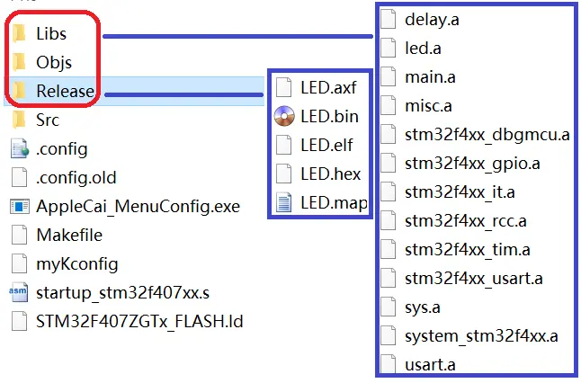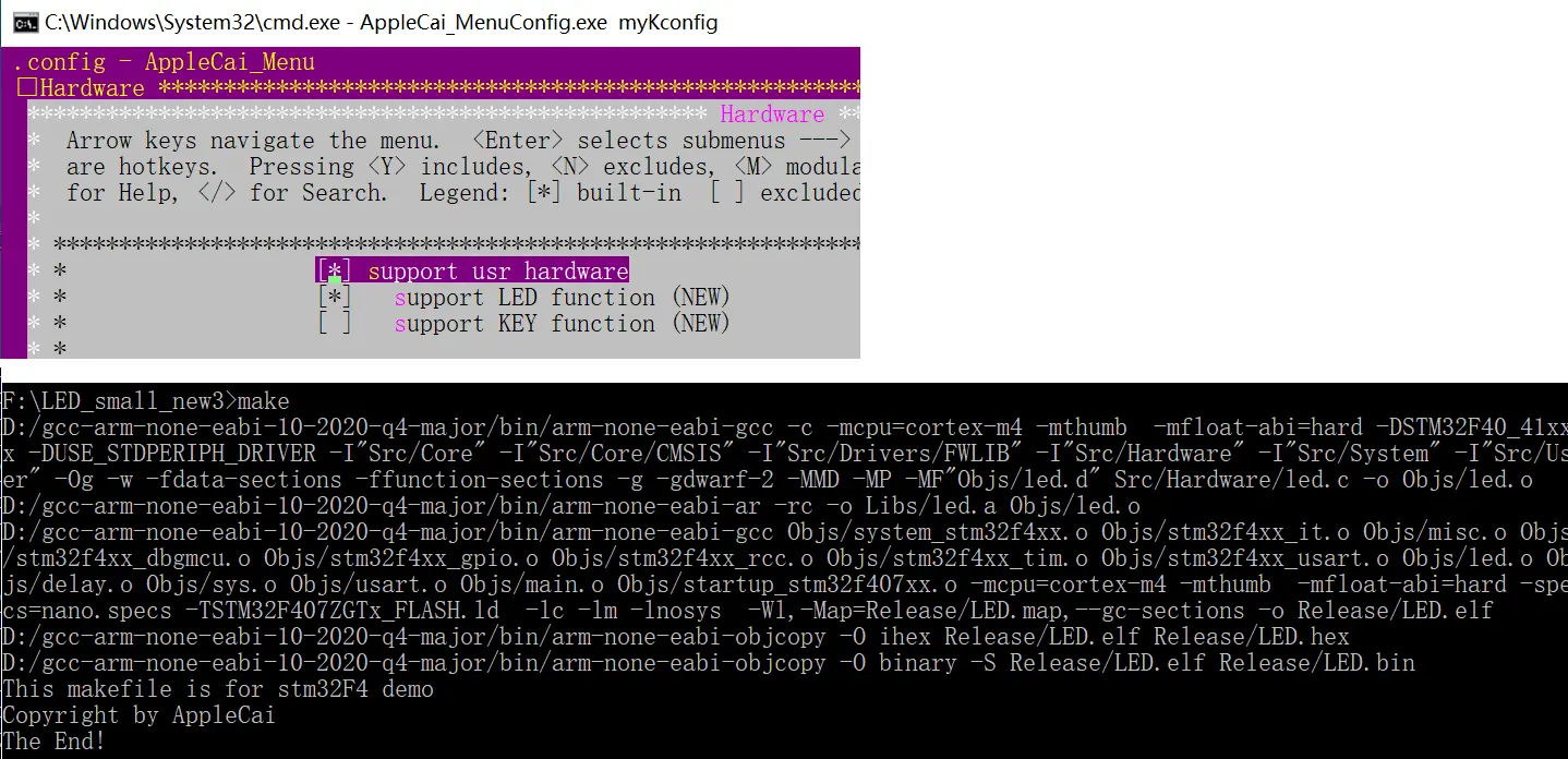 之前已经定制了自己的menuconfig,并且让其生成#define xxx xxx,这样的二次开发工具还是有一些应用场景的,比如不熟悉功能的新手,通过界面的帮助提示来选择功能模块,最后生成config.h文件用来构建code。但是menuconfig主要还是用来生成makefile需要用的配置参数。所以呢,我又换成了之前轻度定制的menuconfig工具,并且基于我之前制作的stm32f4的makefile进行了简单的修改后,加入了.config的配置参数使用,参考nuttxOS工程中的make.defs,我在每个文件夹下添加了make.mk。一个完整的基于win10,带menuconfig的gcc makefile编译工程就完成了。
