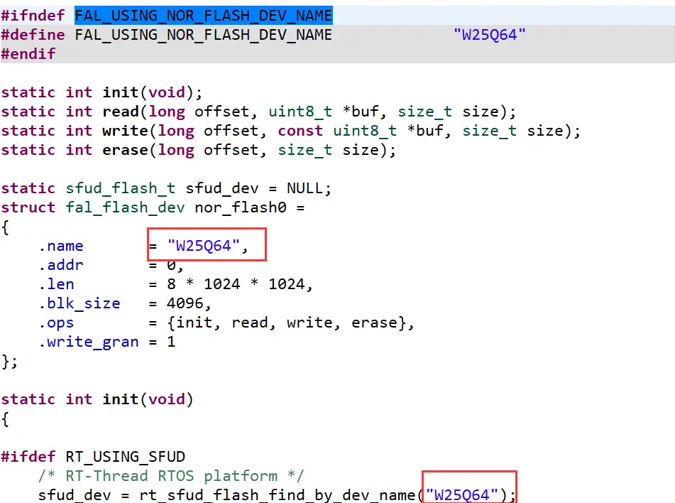 不要相信 FAL_USING_NOR_FLASH_DEV_NAME 这个宏定义,因为 FAL 组件提供的示例中使用该宏定义初始化的,所有我们一般都会默认地修改宏定义的内容为自己的芯片型号,但往往就不能初始化成功。不如直接使用,也就是在下图两个框内处使用。