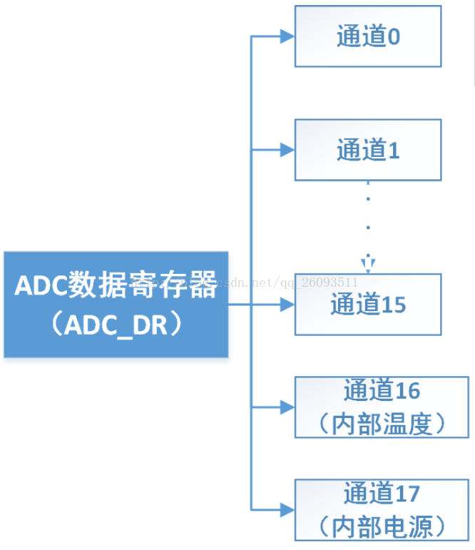 其实就是说,一个ADC,可检测18条通道,我们外接的只有16条。而结果只保存在一个寄存器ADC_DR中。