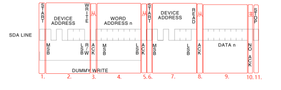 32 for (i=0; i 34 // 发送要写入的数据 35 iic_write_byte(pbuf[i]); 36 // 等待应答 37 ack = iic_wait_ack(); 38 if (ack) 39 { 40 printf('data is err!rn'); 41 return -3; 42 } 43 } 44 // 7.发送停止信号 45 iic_stop(); 46 } 3.4.3 写入多字节的数据(写入数据流) 1 int32_t AT24CXX_Write_Data(uint8_t Addr,uint8_t *pBuf,uint16_t Len) 2 { 3 while(Len--) 4 { 5 AT24CXX_Byte_Write(Addr,pBuf); 6 Addr++; // 目的地址(eeprom中存储数据的地址+1) 7 pBuf++; // 源地址(源数据的地址) 8 } 9 return 0; 10 } 3.5 从AT24CXX读数据 3.5.1 任意地址读一个byte(Random Read) 1 uint8_t AT24CXX_Read_Byte_Random(uint8_t addr) 2 { 3 uint8_t byte; 4 uint8_t ack; 5 6 // 1.发送开始信号 7 iic_start(); 8 9 // 2.写入要读的设备地址(硬件设备id),为写方向 10 iic_write_byte(0xA0); 11 12 // 3.等待从机应答信号 13 ack = iic_wait_ack(); 14 if (ack) 15 { 16 printf('When Master read randomly,what write slave device address is error! rn'); 17 return -1; 18 } 19 20 // 4.写入从机设备(eeprom)中,要读的位置 21 iic_write_byte(addr); 22 23 // 5.等待从机应答信号 24 ack = iic_wait_ack(); 25 if (ack) 26 { 27 printf('When Master read randomly,what write data address in slave is error! rn'); 28 return -2; 29 } 30 31 // 6.发送开始信号 32 iic_start(); 33 34 // 7.写入要读的设备地址(硬件设备id),为读方向 35 iic_write_byte(0xA1); 36 37 // 8.等待从机应答信号 38 ack = iic_wait_ack(); 39 if (ack) 40 { 41 printf('When Master read randomly,what write data address in slave is error! rn'); 42 return -2; 43 } 44 45 // 9.读取从机数据(eeprom) 46 byte = iic_read_byte(); 47 48 // 10.主机不应答 49 iic_no_ack(); 50 51 // 11.发送停止信号 52 iic_stop(); 53 54 return byte; 55 } 3.5.2 读出short或int型的数据 1 /** 2 * @brief 在AT24XX里面的指定地址开始读出长度为Len的数据,该函数用于读出 3 * 读出16bit或者32bit的数据 4 * @param ReadAddr:开始读出的地址 5 * @param Len: 读出数据的长度2,4 6 * 7 * @retval 数据 8 */ 9 uint32_t AT24CXX_ReadLenByte(uint16_t ReadAddr,uint8_t Len) 10 { 11 uint8_t t; 12 uint32_t temp=0; 13 for(t=0;t 15 temp<<=8; 16 temp+=AT24CXX_ReadOneByte(ReadAddr+Len-t-1); // 17 } 18 return temp; 19 } 3.5.3 读出epprom中一定长度的数据 1 /** 2 * @brief 在AT24XX里面的指定地址开始读出指定长度为Len的数据 3 * @param ReadAddr:开始读出的地址,对24c02为0-255 4 * @param pData: 输出数据数组首地址 5 * @param Len: 要读数据的个数 6 7 */ 8 void AT24CXX_Read_Data(uint16_t addr,uint8_t *pData, uint16_t DataLen) 9 { 10 while (DataLen--) 11 { 12 *pData++ = AT24CXX_Read_Byte_Random(addr++); 13 } 14 }