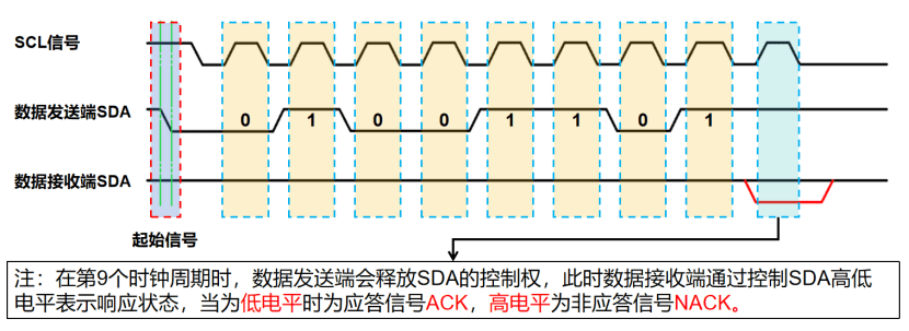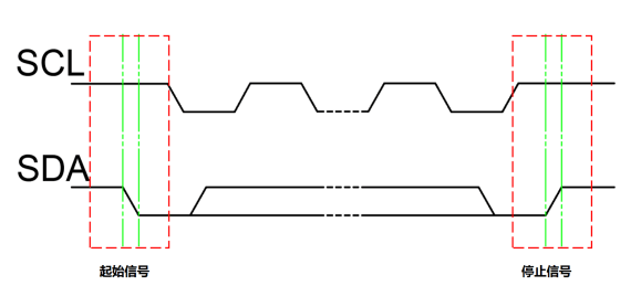 起始信号:SCL为高电平期间,SDA从高电平跳变至低电平。