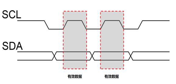 当SCL为高电平时,SDA数据有效(SDA为高电平时数据为1,低电平时数据为0);当SCL为低电平时,SDA跳变为下一次传输的数据。