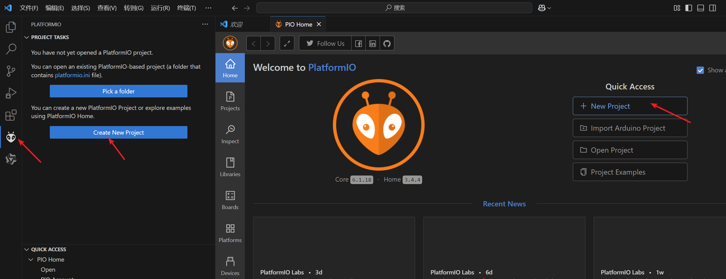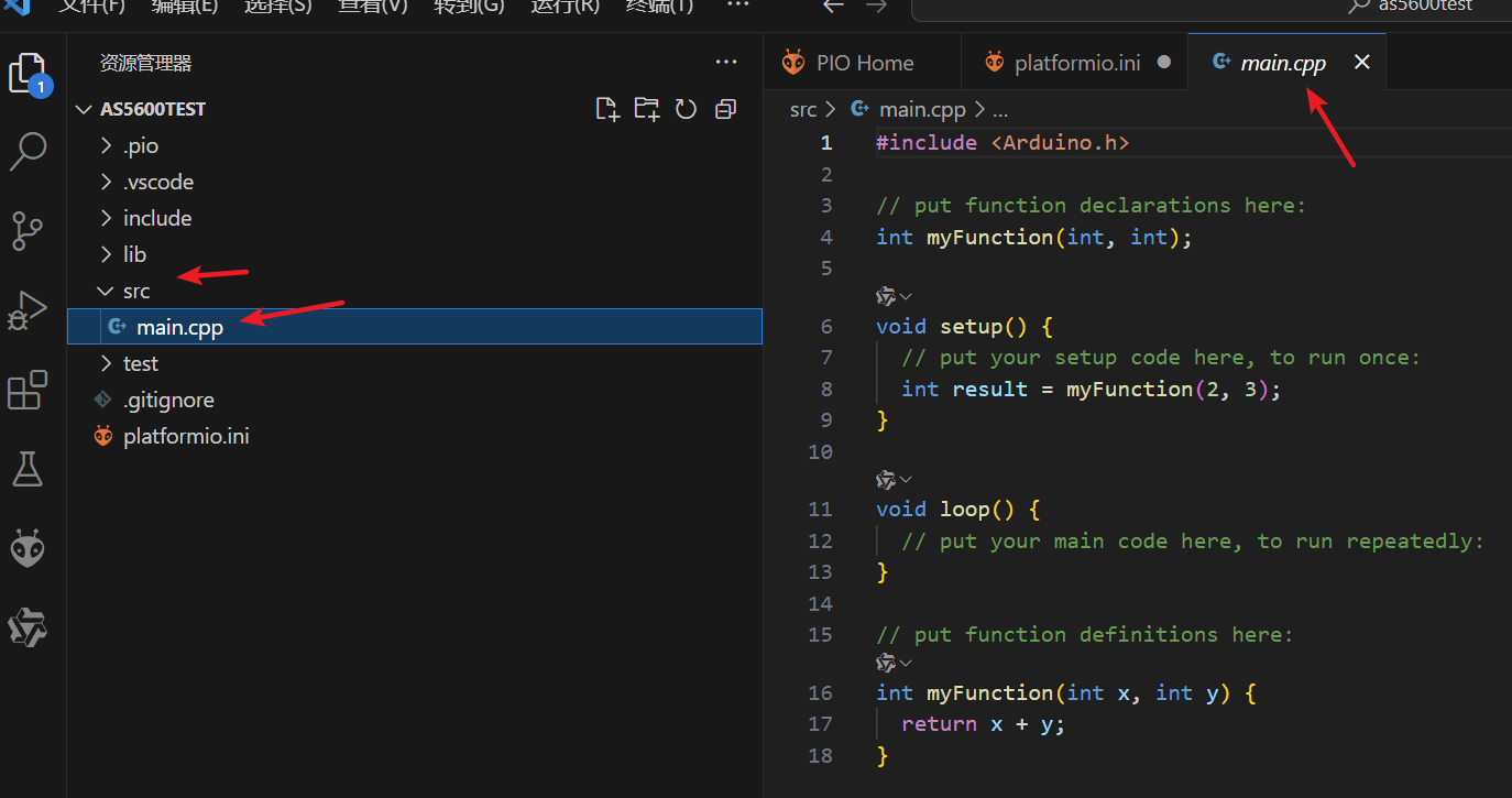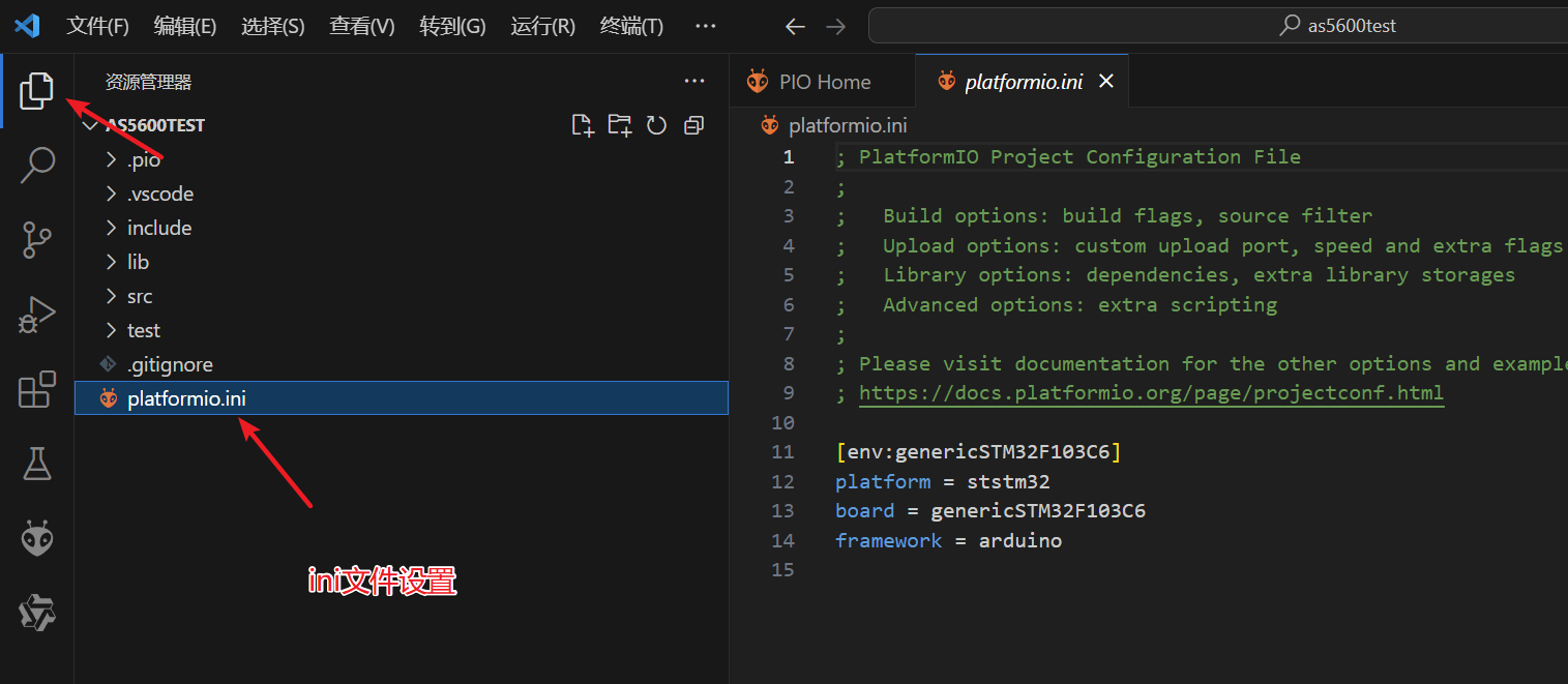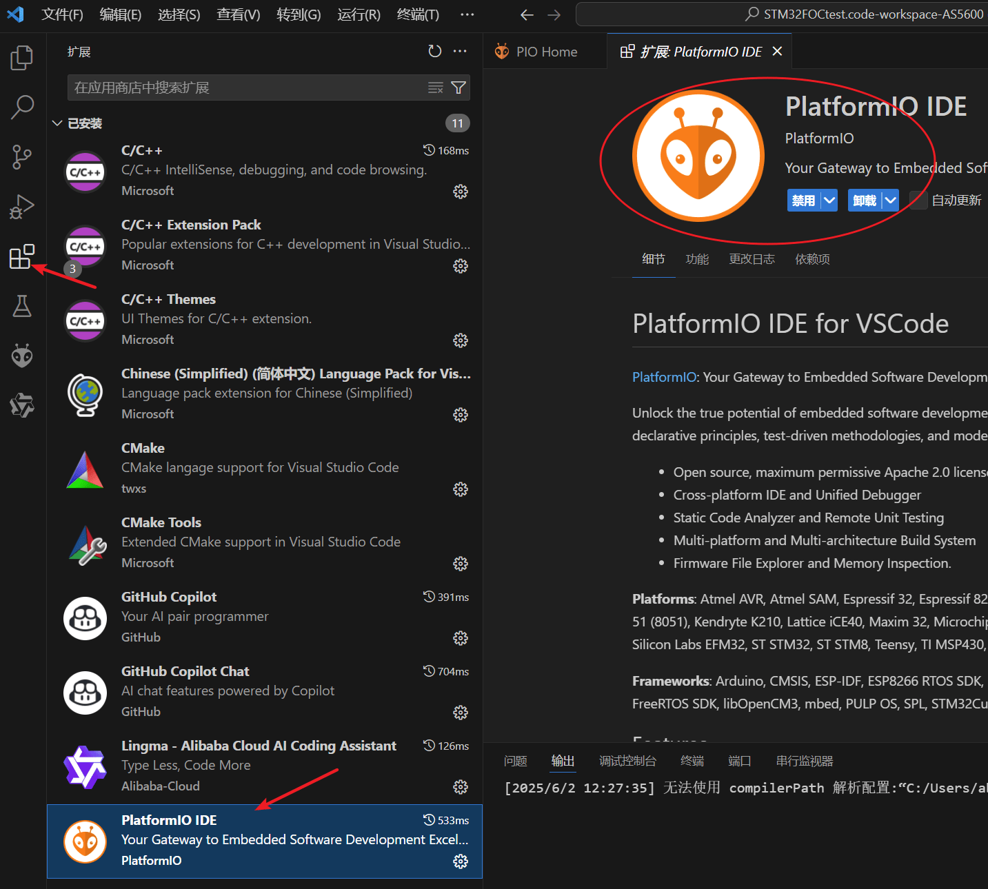 打开vscode并安装PlatformIO插件。其他的一些中文插件、AI插件等等,根据需要安装