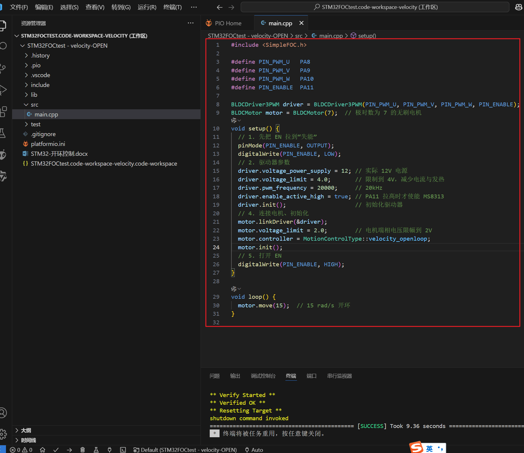 motor.move(15); // 15 rad/s 开环