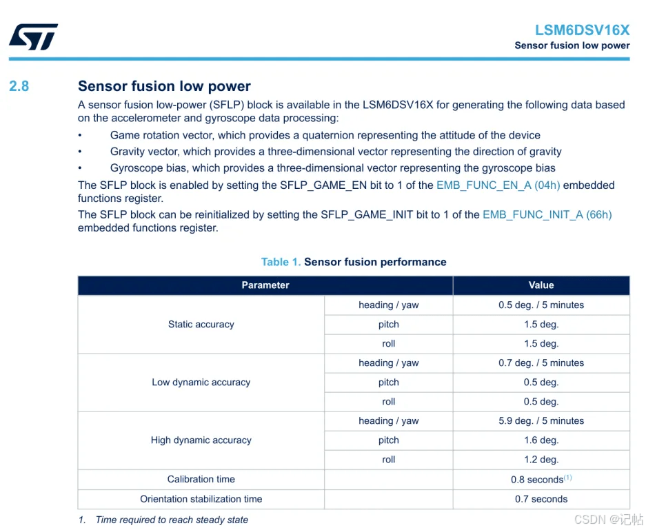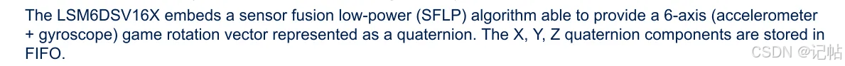 LSM6DSV16X 特性涉及到的是一种低功耗的传感器融合算法(Sensor Fusion Low Power, SFLP).