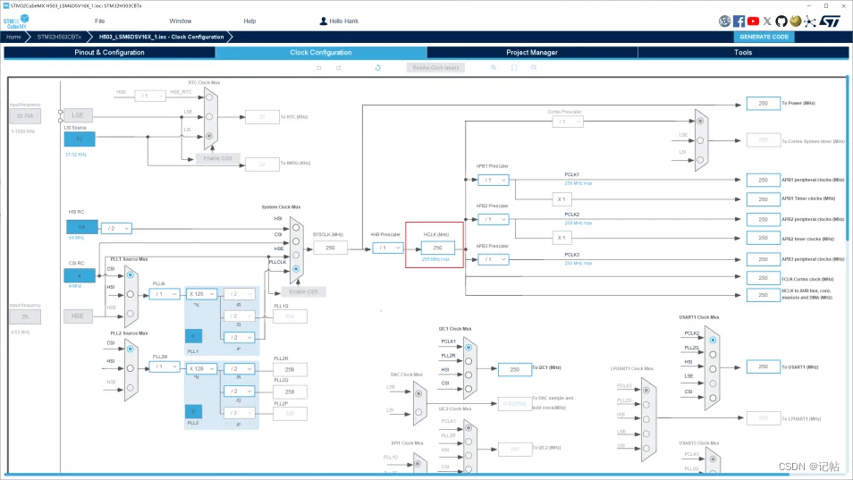 配置时钟树,配置时钟为250M。