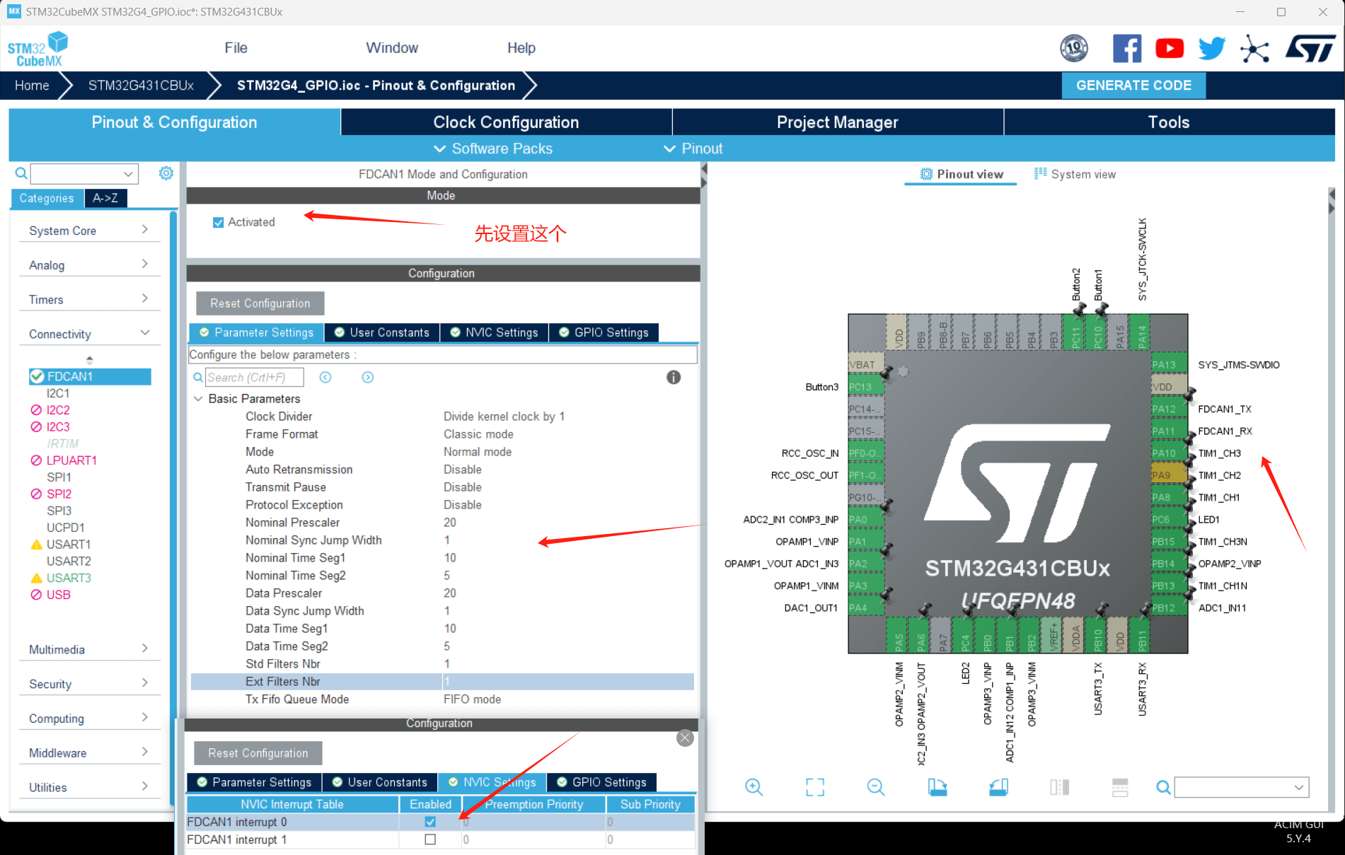 首先配置cubeMx程序,在上一章的基础上使能CAN外设