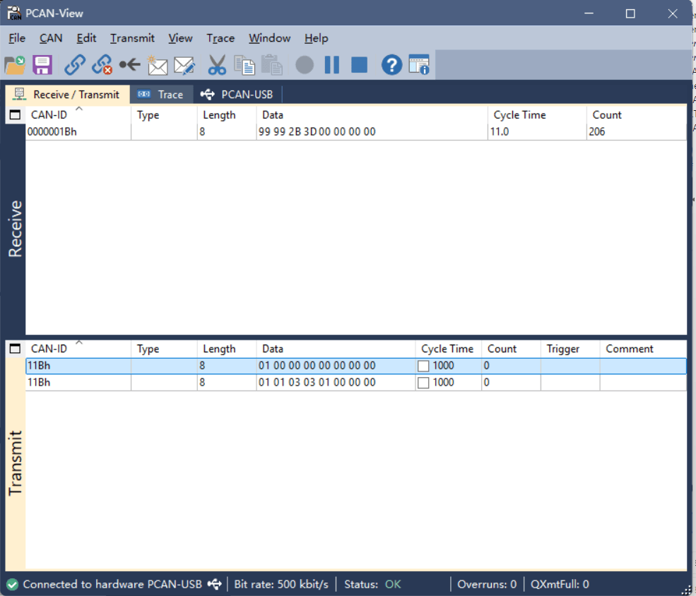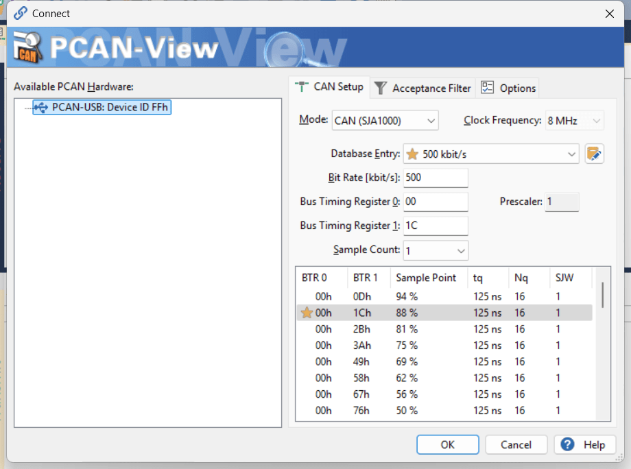 打开PCAN上位机,选择500k波特率,点击OK