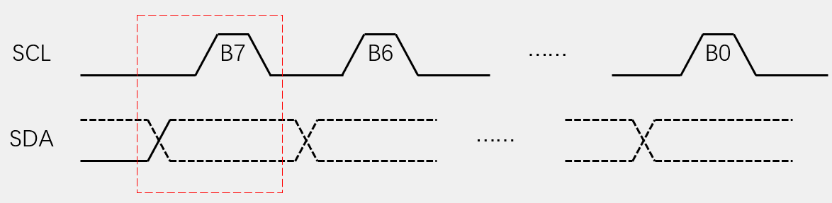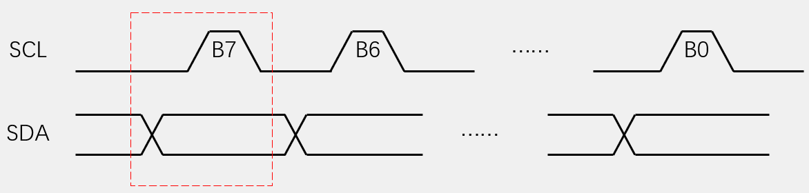 发送一个字节:SCL低电平期间,主机将数据位依次放到SDA线上(高位先行),然后释放SCL,从机将在SCL高电平期间读取数据位,所以SCL高电平期间SDA不允许有数据变化,依次循环上述过程8次,即可发送一个字节