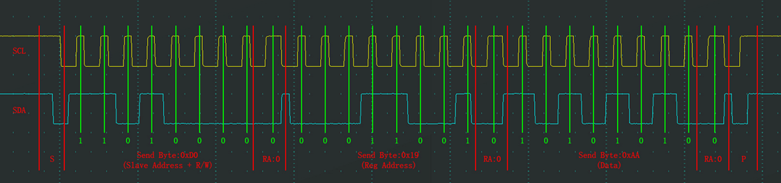 对于指定设备(Slave Address 0xD0),在指定地址(Reg Address 0x19)下,写入指定数据(Data 0xAA)
