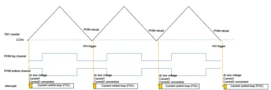 ADC配置需要使用 PWM 和 ADC 的同步机制,ADC 的采样由 TIM1 的 CCR4在 0 矢量中心附近触发:
