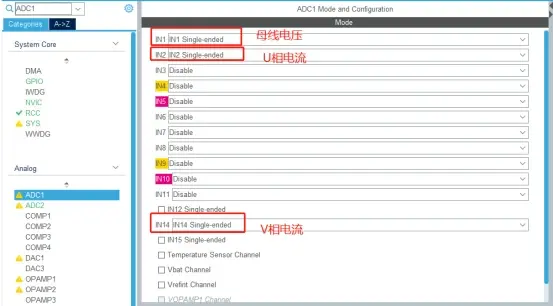 首先配置三相电流和母线电压的ADC通道,此处根据硬件平台原理图去配置