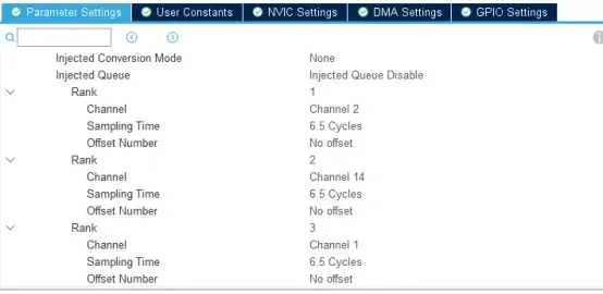 Injected Rank :这个就是注入序列,一旦ADC开始注入转换,就会按照Rank1-2-3-4的顺序依次进行采样,每个rank只能选择一个对应的通道。每个通道对应ADC输入引脚