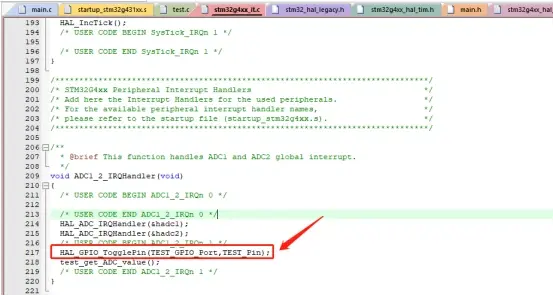 在中断文件stm32g4xx_it.c中ADC1_2_IRQHandler处添加测试引脚翻转函数,测试ADC的采样时间点